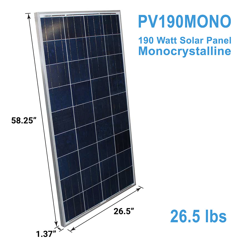 The 190 Watt Monocrystalline Solar Panel from AIMS Power is a versatile performer constructed with tempered glass and a stronger surface to protect from harsh weather conditions. The solar cells used in this panel provide high light transmission and the textured glass allows for a more efficient panel. The panel also includes a bypass diode that minimizes the power drop caused by shade. Easy to install using the pre-drilled holes on the aluminum outer frame. Perfect for home, vehicle and RV installations and industrial applications.