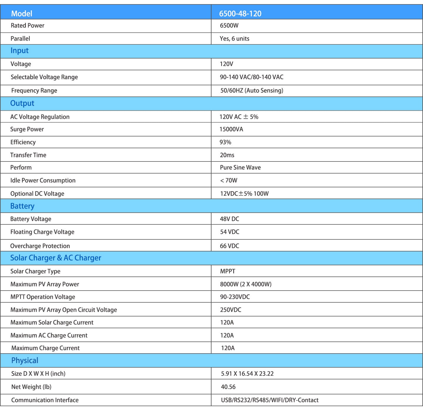 ★ Solar Inverter: 6.5KW DC 48V pure sine wave AC output 120V, Built-in MPPT solar charger max 120A and utility battery charger max 120A, Max PV input 390V (VOC), Dual PV input. UL 1741 Standard Listed by TUV / CSA / FCC.